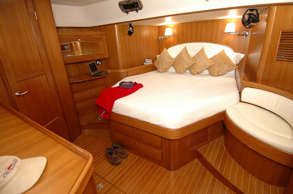 The aft cabin is sumptuous and has abundant storage. A queen-size island double dominates it; drawers pull out from the forward end, and the whole bunk top opens, like the trunk lid on a car, on gas rams for access to more storage aft without having to unmake the berth. The generous head compartment features a separate shower stall with another high sill.