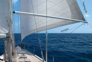 While the pole is still stowed on deck, attach the topping lift and foreguy. Take up the slack in the topping lift. Leave a few feet of slack in the foreguy. If you’re already sailing deep off the wind, the jib at this point Should be furled.