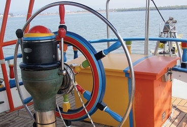 We’d put so much thought into picking out the colors that when it came time to paint, it wasn’t really necessary to meticulously plan where each color would go. As a general rule, I used the blues for the larger areas, and I saved the bright orange, yellow, and green for accents. We still used disposable brushes, but for the details I also busted out some of my old art-school brushes to get a finer edge. As most of the colors were custom-mixed from the Pettit palette, we bought some plastic screw-top jars and mixed up our own shades about a pint at a time. The paint dried fast in the Mexican sun, so we decanted tiny amounts into plastic cups while we worked. For the surfaces on which we were likely to stand, such as the rubrail, the hatch cover, and the bow pulpit, we mixed beach sand into the paint to create homemade nonskid.