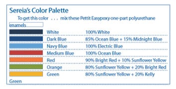 For one thing, my husband, Peter, and I couldn’t afford to repaint the white hull and navy-blue boot stripe, so these hues would have to be incorporated into the overall scheme. For simplicity’s sake, I went with one-part polyurethane paint; a comparison of color charts revealed to me that Pettit had a brilliant line of available colors.