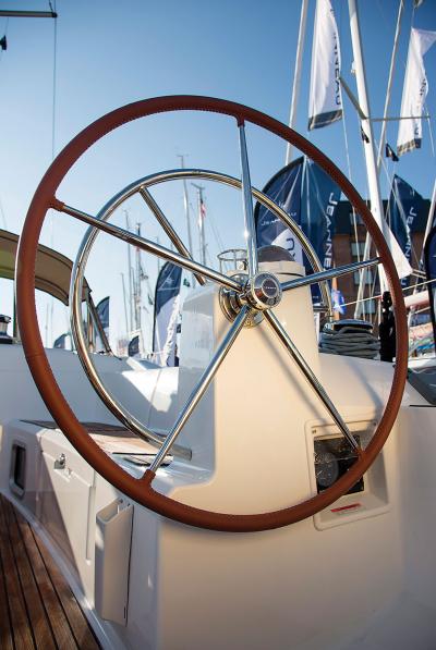 | |_Aboard the Jeanneau 509, the molded pedestal for the steering wheel also provides a nice, rounded seat back just forward, adjacent to the long cockpit bench. _|