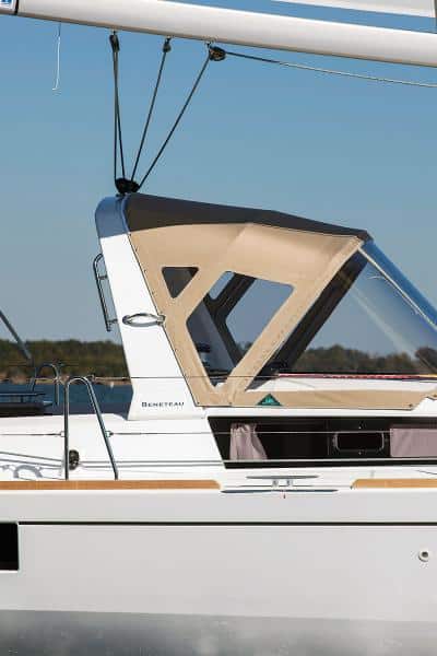 | |_The integral arch over the cockpit of the Beneteau Oceanis 48 serves multiple purposes: It provides good handholds and an excellent frame for a strong dodger, and also anchors the mainsheet _fittings.|