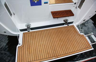 The latest cockpit craze is the drop-down hinged transom. When raised, it provides gunwale-to-gunwale aft seating and creates the sense of security that only comes from an entirely enclosed cockpit; when lowered, it becomes the aforementioned boarding platform. Either a simple rope/tackle setup or an electric or hydraulic mechanism operates these platforms. Although these “trick transoms” may at first seem gimmicky, in tight marinas their ability to retract can be very handy, particularly by extending usable deck space (when down) while reducing the cost of berthing (when up). Flip-up transoms — such as those found on the Beneteau Sense 46, where the helm seats fold up to open the entire transom — are an offshoot of this idea, though they don’t provide the same containment aft.
