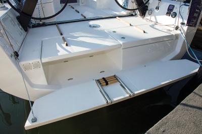 | |The drop-down transom on the Hanse 415 is well-executed. Along with the handy swim platform aft, the cockpit features a central table with a chartplotter mounted amidships for good visibility from the twin helms. A nice touch is the dedicated locker for stashing fenders.|