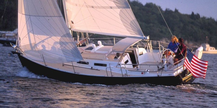 For off-the-wind work, an optional spinnaker hardware package includes all the gear necessary to fly a cruising chute tacked to the stemhead fitting and to set and douse it using a spinnaker sock. No poles, guys or fuss — and again, an easy 6-plus-knots in moderate air on a beam to broad reach.
