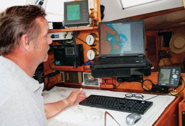 Upon landfall in the civilized world, I replaced the GPS-75 with Garmin’s workhorse model GPS-128. Albeit slowly, I eventually learn my lessons, and I now back that up with a portable Garmin 76 that’s wrapped in a foil Faraday cage to protect it from lightning and stowed in the waterproof overboard barrel. Antiquated as it sounds, I also keep my trusty sextant, a current almanac, and sight reduction tables on board.