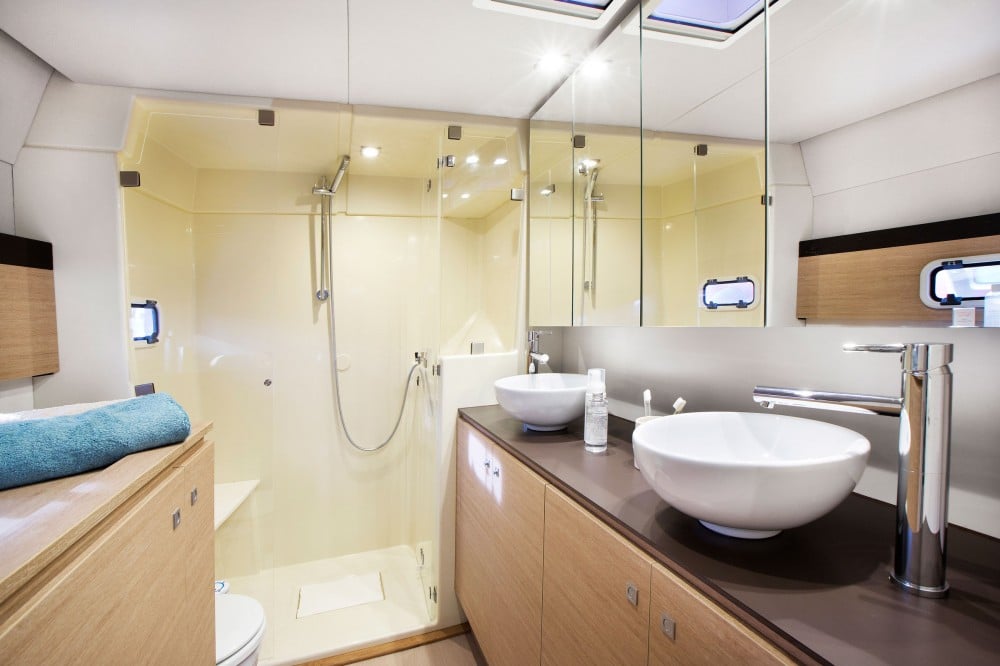 To be concise, the new Bali is a laid-back cruising machine, one easily imagined in some tropical port. It’s in a trade-winds anchorage, after all, that you’d most appreciate the breeze when the large glass center window in the front of the saloon is lowered with the flip of a switch, and when the rear sliding doors to the aft cockpit are opened wide to let the air flow through. “Open Space,” the marketing brochure promises — and that’s what Catana’s Olivier Poncin, naval architect Xavier Faÿ, interior designer Hervé Couëdel and the Catana design team have delivered.