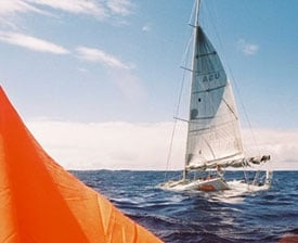 The crew saw a pod of about four whales, including a calf, and had actually changed course slightly to give them a wide berth. At about 0715 local time, they were getting back on course when the calf swam down the port side of Mureadritta’s XL. The mother, perhaps trying to protect the calf, or just to get back to it, rammed the starboard side, forward of the chainplate. The impact was felt and heard, rather than seen. The crewman on the port side only saw the dorsal fin of a pilot whale, which immediately dove under after striking the boat. They didn’t see the whale again, but Nick said, “She probably had a good gash on the nose, or at least a pretty bad headache.”