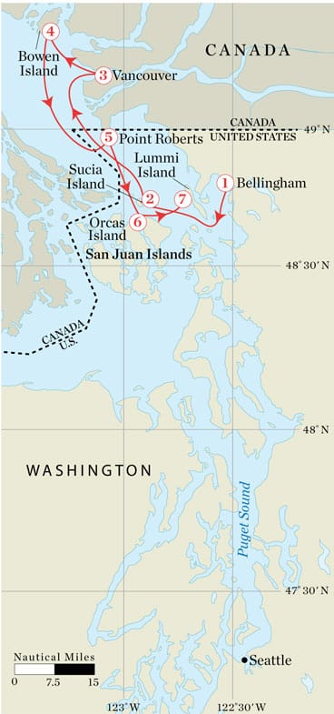 Columbia, Canada, and included stops in the cosmopolitan city of Vancouver, as well as its lush, rural opposite, nearby Bowen Island, before heading back south. Clearing in with Canadian and U.S. customs officials was, of course, part of the itinerary.