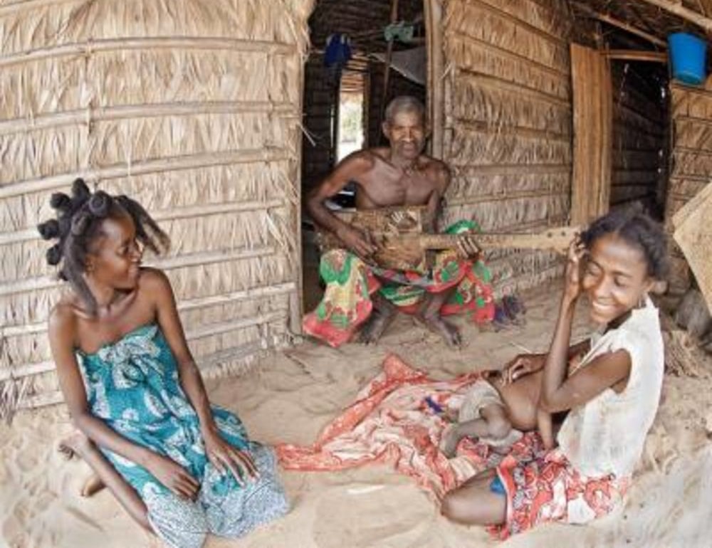 Most of the Vezo people along the west shores of Madagascar live in small villages, typically in little huts of reeds and bamboo. The majority of them relaxed around their homes, quietly excited at having visitors. The most energy radiated from a cluster of women who, under a mango tree, swung long pestles made of shiny hardwood to pound rice in wooden mortars. They shrieked with laughter at their images in a digital camera and posed again with improved postures. In the doorway of a hut, a man strummed a stringed instrument, homemade and square-cornered. A muscular fellow, his ax razor sharp, put the finishing and precise touches on small pirogues that he and his wife had under construction.
