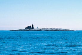 Sailing with my family a few years ago, we arrived at Mount Desert Rock on a light-wind day with little swell, though there was a strong current sweeping around the island. Tying up to the mooring buoy was tricky, and it took several tries to get a line through its eye. Once secure, my daughter Kristi and I rowed the dinghy to the landing ramp. Halfway to shore a whale surfaced next to us; it looked big from our eight-foot boat. The whale kept swimming, and I kept rowing. Dozens of seals eyeballed our movements as if they were the guardians of the place.