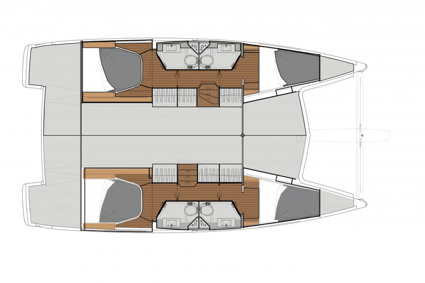 The new 40 foot catamaran is offered in two versions, one of which is an owner version that features an owner’s cabins well as space for guests with separate heads.