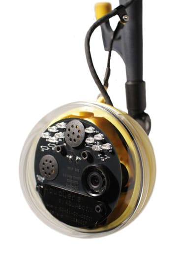 With the portable, compact, battery-operated AquaLens live video camera from Aquabotix attached to the end of your boat hook, you can check your propeller, rudder, keel, or hull—or just have a gaze at what’s happening below the waves—while staying dry as a bone topside. The nifty AquaLens, complete with a standard 15-foot cable, L.E.D. lighting, infrared night vision, and an anti-fogging lens, runs on eight AA batteries or with an optional 12-volt power cord or 120-volt power adapter. Simply strap the 3.5-inch L.C.D. monitor/screen on your arm like a wristwatch (the arm band is included) and have a good look around.