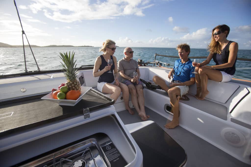 The G4 features a large comfortable cockpit and saloon, where, upon return from your highspeed cruise, you will have time to shower, nap, and plan the post-sail gathering. Your friends will be drawn to the spacious and comfortable cockpit. The salon offers comfortable seating with ample headroom when seated. The galley island, complete with two burner stove top, 100 litre fridge drawer, and sink, is centrally located to entertain.