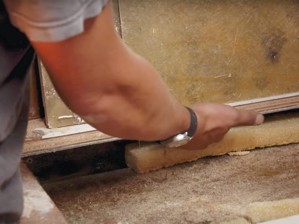 With a multitool and circular saw, Chris cut out the remaining large pieces of the fiberglass liner to access the walls and bottom of the fridge cavity. There, we uncovered the remains of wet, moldy foam that undoubtedly added to the overall inefficiency.