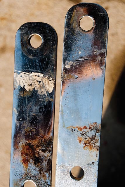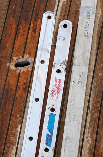 | |Three degrees of chainplate separation: the old chainplate (center), the new 316L bar stock (right) and the finished, polished, brand-new chainplate (left).| |
