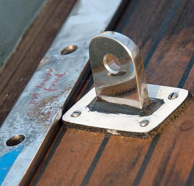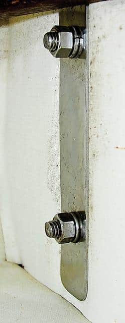 | |Belowdecks, the chainplate fasteners pass through a long 1/8-inch backing plate.| |
