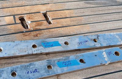| |In this image, the damaged balsa core, which is typical in older classic-plastic production boats, is visible through the deck slots. Make sure to mark and identify the old chainplates before giving them to the fabricators. They will mark the new ones accordingly.| |