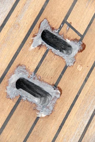 | |The real key to a chainplate replacement job will be how well you effect the repairs to the old balsa core and the deck slots. For my project, I cleared about an inch of balsa core from between the layers of deck laminate and rebuilt the area with thickened epoxy. This not only stiffened the deck, but also created a wall of solid epoxy that would protect the balsa from seawater in the event that the sealant broke down.| |