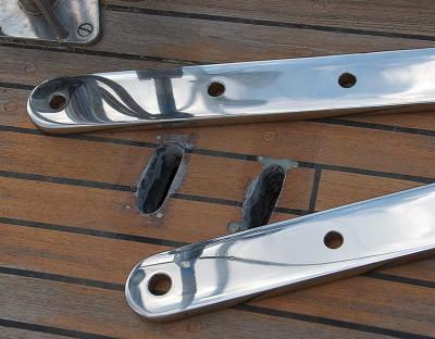 | |The new, polished chainplates for the intermediate and upper shrouds are ready to go in.|To prevent future leaks, I discarded the original stainless cover plates for the original chainplates and replaced them with larger cover plates fabricated from prefab fiberglass sheets.|I bedded the new cover plates with a buildup of BoatLIFE polysulfide sealant.|