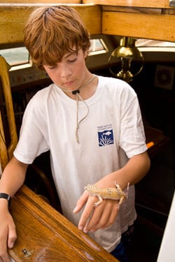 Other boats have dogs, cats, parrots. We have a lizard (and also my daughter’s two hermit crabs, but that’s a whole other story). Granted, she’s a very pretty, domestically bred leopard gecko, but she’s still a reptile, an animal only a boy could find cuddly. Bandy the gecko has sailed with us since the beginning, living in a palatial habitat. For cool weather, she has a heat pad and lamp, both of which drive my husband to distraction because of the sheer amp suck. In warm weather, she gets spritz-bottle rain showers. She spends her days doing that lizard thing, hanging out with her eyes half shut like a Holiday Inn lounge singer.