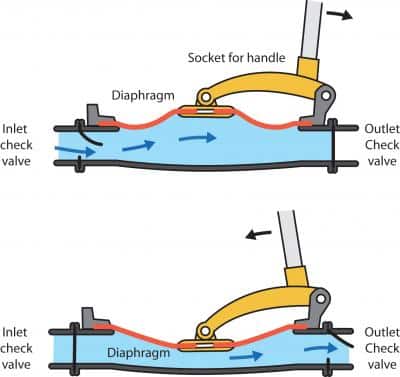 With mechanical diaphragm pumps, pushing a handle back and forth moves the diaphragm up and down, expanding and contracting the space inside the housing. When the space expands, it creates vacuum pressure at the inlet port, drawing water in. The check valve on that end is designed to open in that direction but close when the hydraulic pressure comes from the other direction. When the pump handle moves down, it contracts the volume inside the chamber, forcing water out past the outlet valve.