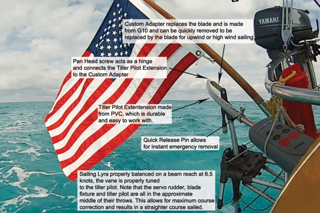 - With Lyra balanced on a 6.5-knot beam reach, the vane is properly tuned with the tiller pilot. The servo-rudder, blade and tiller pilot are in the approximate middle of their throws, allowing for maximum course corrections.