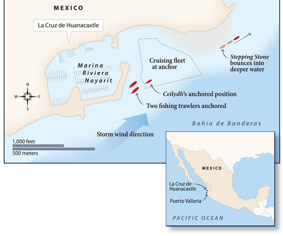 Bad weather is something we’re prepared for—at sea. But when the passage is over and we’ve dropped the hook, hurricane-force winds and 6-foot seas are the last things we expect. But we realize that extreme weather can happen just about anywhere. We experienced this firsthand when winds in excess of 80 knots ripped through Bahía de Banderas, on Mexico’s mainland near Puerto Vallarta, toppling trees, blowing windows out of high rises, and cutting power to towns around the bay. Over half of the 60 or so boats anchored in La Cruz de Huanacaxtle, in the northern part of the bay, dragged or lost their anchors, and dozens more ended up with shredded sails or impact damage. Two boats went aground.