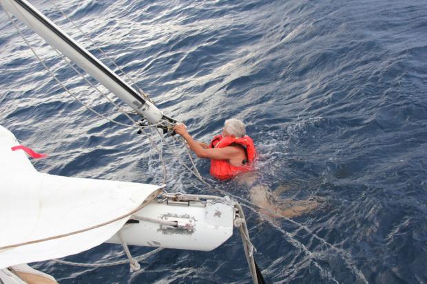 Although_ Brick House_, our Valiant 40, was no longer moving, I wore a life jacket and rope tether for my initial trip into the ocean. If I became injured or the boat began to move again, this would give Rebecca a lifeline to me. Later, swim fins without a lifejacket gave me the mobility needed to complete the work.