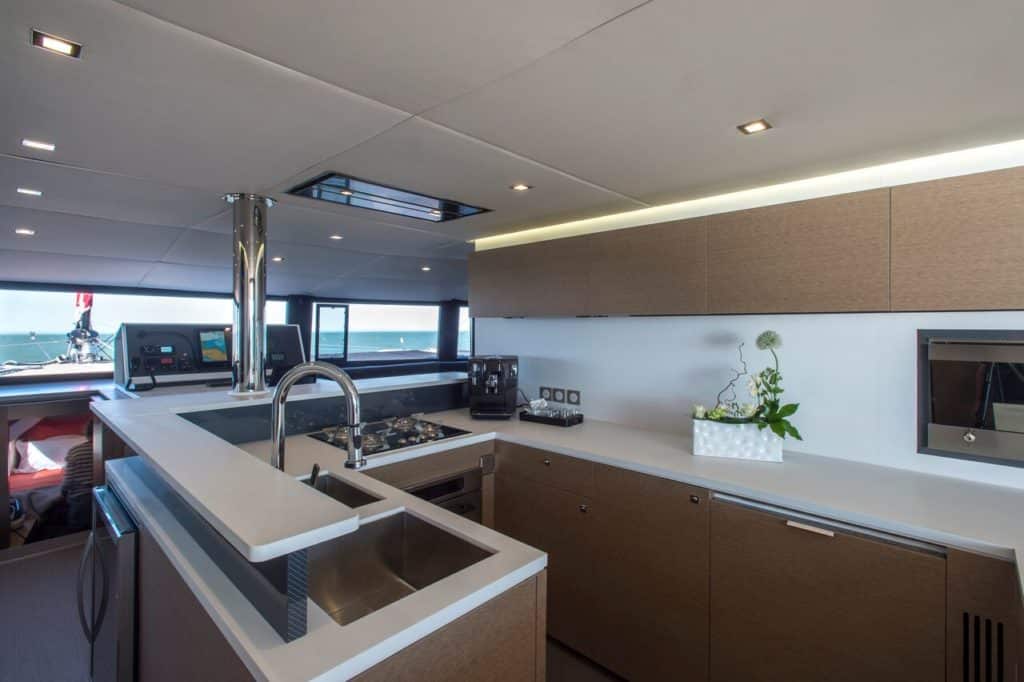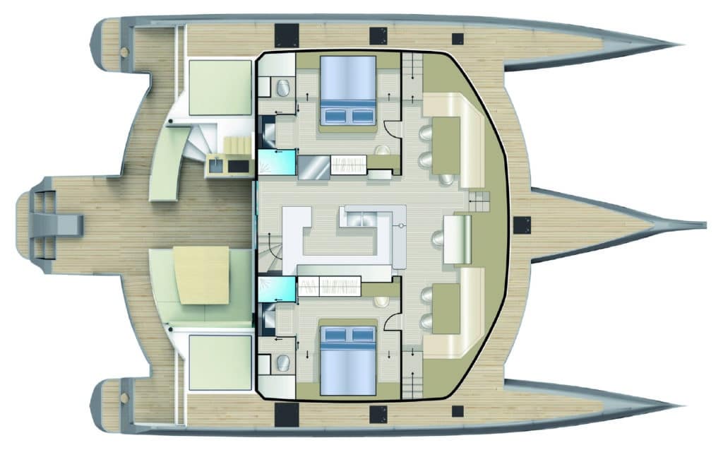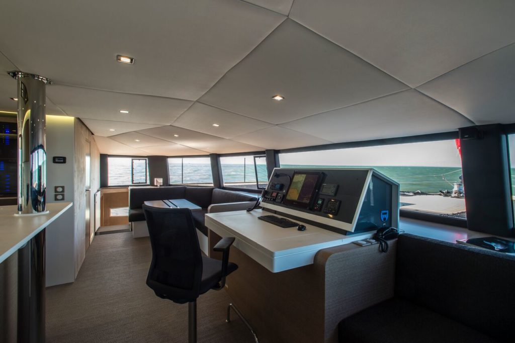 On the deck the wide cockpit (25 m2) with its outdoor kitchen, exclusive to the NEEL 65, are found alongside the spacious storage bins for leisure equipment (canoeing, windsurfing, paddleboards) in the skirts of the floats for quick and direct access to the sea.