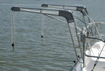 Forespar’s Nova Davit is designed to be mounted on the stern of boats that have pushpits. Construction is of stainless steel with Marelon gussets at the bend and at the outboard end. Combined, the davits can lift 350 pounds and they extend 45 inches from the stern to hoist wide dinghies. The apparatus uses Harken roller bearing blocks, so your muscle power goes into hoisting rather than overcoming friction. You can swing the davits out of the way when they’re not in use, or remove them altogether.