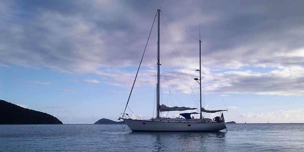 My old friend and shipmate Geoff Curtain lent me his Olympic 48 ketch, Ariel, so I could take family on a 16-day cruise over Christmas and New Year’s — not exactly a quiet time in the Virgin Islands. With me were Trich, my wife of 48 years; our daughter, Dory, and her husband, Scott Vogel; and their two children, Dylan, 22, and Emma Kate, 18. We hit many of the “checklist” spots on a typical Virgin Islands bareboat itinerary, but we also spent many nights in quiet anchorages.