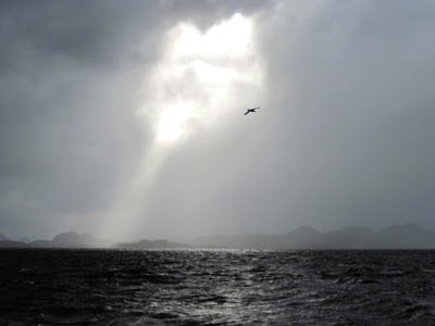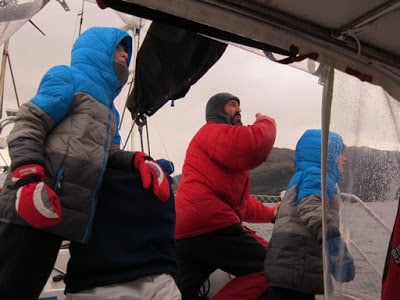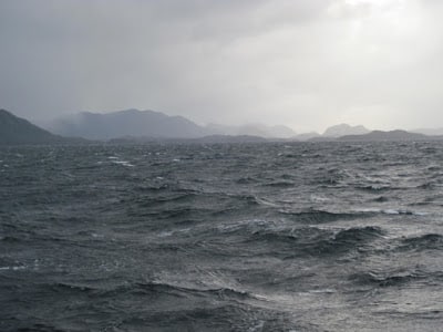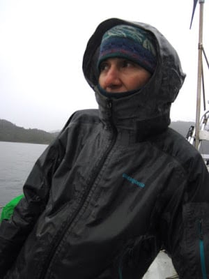 As we continued southwards I became convinced that I could see the snow line coming closer with every mile we traveled. We are on half rations of propane and so a warm breakfast and lunch and endless cuppas are not among our consolations in the wet and cold. Alisa though is a champ about giving the on-deck crew the lion’s share of the hot water from the thermos and Elias is very delighted with himself for being the first to give voice to the idea that we might heat water on the diesel stove while at anchor. Which we are, quite successfully, and short diesel is not a problem that we are contemplating. Alisa has reacted to the propane shortage by doubling or tripling the amount of bread she makes on each baking day, reasoning that the increased production takes little or no more propane than her normal two loaves. She also has produced pigs in a blanket on her last baking day and has promised them for today – hot dogs wrapped in extra dough. So we have a hot lunch to look forward to. All sorts of food that are normally “just in case” rations – hot dogs and canned fruit most notably – have become staples. No one is grumbling about the shortage and though Alisa is occasionally at a complete loss when meal time arrives she has expressed the upside in the form of not feeling her normal remorse and responsibility if a meal falls short of expectation. Which of course they never do. We’ll all feel the luxury of living with no limits to the propane whenever that happy day comes again.