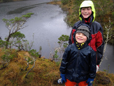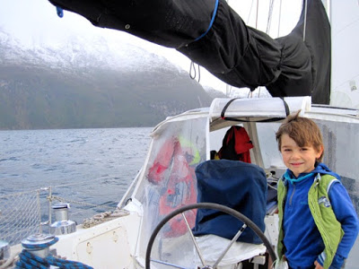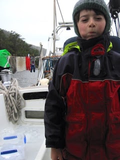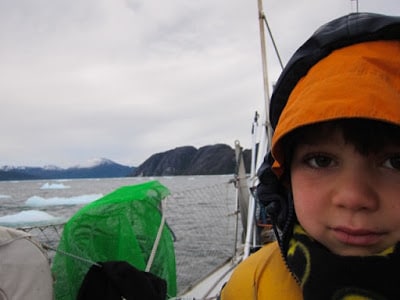 The boys quite enjoyed our arrival at Caleta Tilman because low tide revealed a scrap of open land that might more or less reasonably be called a beach, and with it the attendant chance to walk a few hundred meters before turning around. Eric has in all the innocence of extreme youth asked Alisa why we came to this place (meaning Patagonia), anyway? He feels the enforced confinement more than Elias who can read Harry Potter over and over. Eric has been pining a bit for Polynesia, where at least he could swim, though his inability to swim at the ripe old age of four, and now five, has attracted quite a bit of negative attention from management on board Galactic. On the bright side he is just now learning the basics of literacy, though he takes greatest delight in reading (and writing, in a surprisingly clear hand) words like “scream”, “stinky”, “fart” and “butt”.