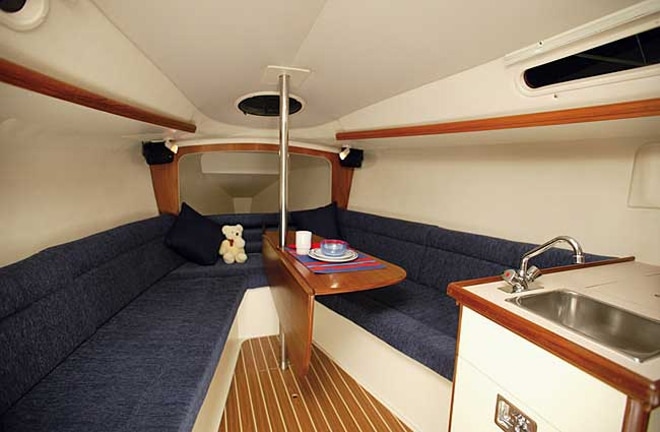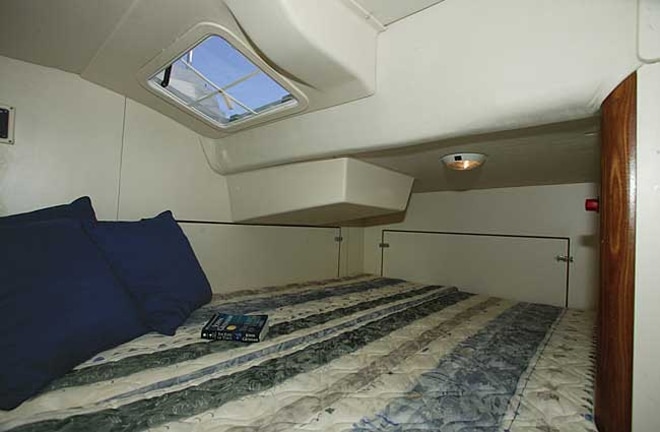 Right down to the shore-power supply, the half-electric/half-butane two-burner stove, the microwave, and the 12-volt cooler that you load at home and stow in a specially built drawer in the galley, this boat is equally well equipped for life at the dock and for sorties to nearby cruising grounds.