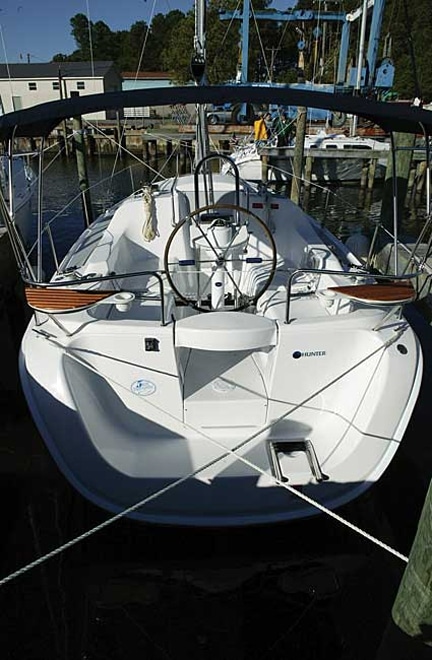 Another big-boat feature is the wheel steering. At 27 feet, the boat is at the margin between the practicality of a tiller and the comfort of a wheel, but Hunter insists the market has embraced wheel steering, so a wheel it is. The optional Lewmar folding wheel further improves access to the walk-through transom, but it’s pushed so far aft to open up the cockpit that the stern lifeline interferes with the helm seat. As on all Hunters, back-seat drivers can second-guess the skipper from perches in the corner pushpits, but they’d better not be too critical, as guest spots on this boat will be easy to fill.