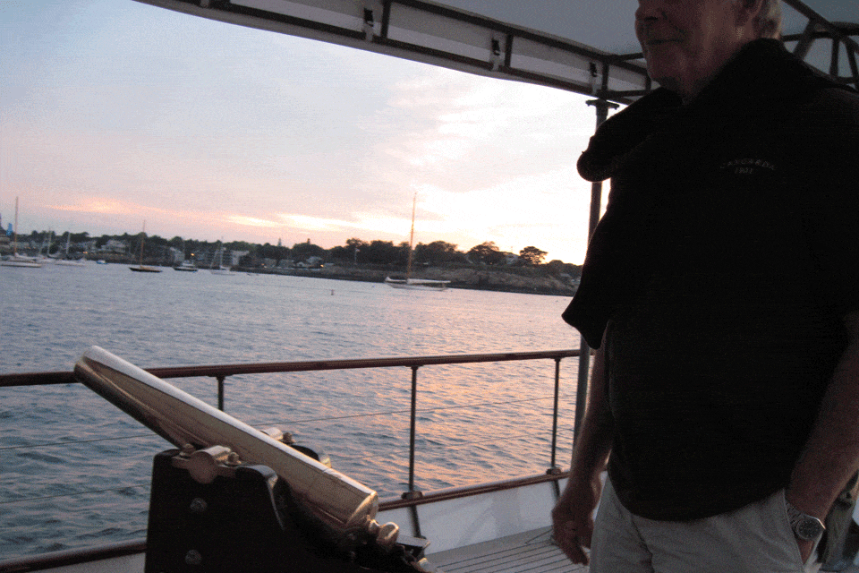 Bob McNeil, restorer and owner of the steam yacht Cangarda, the schooner Coronet, and the Herreshoff P-Class sloop Joyant, fired the cannon at sundown Saturday.Elaine Lembo