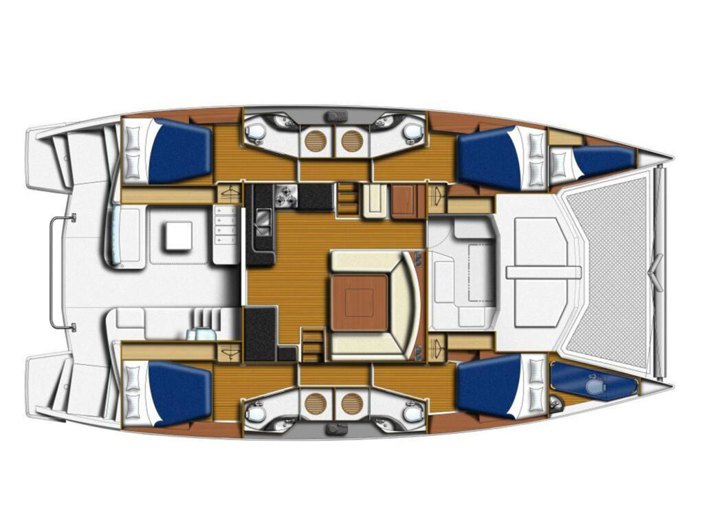 The award-winning Leopard 48 offers blue water performance and comfortable living spaces, making the model a popular choice among the Leopard line of cruising catamarans. The Leopard 48 features a large forward cockpit with direct access from the salon and a stairway to the forward platform. Noteworthy exterior features include a large and open aft cockpit with cockpit table and a raised helm station, providing excellent panoramic visibility and easy maneuverability. The forward cockpit/lounge has become a distinguishing characteristic on the Leopards, and the one on the 48 has been exquisitely rendered.