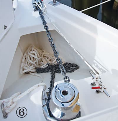 This simple, sensible setup consists of a recessed windlass and a full-size locker lid opening to a generous storage space. The chain lead is fair, and there’s even a dedicated cleat for a snubber. Billy Black