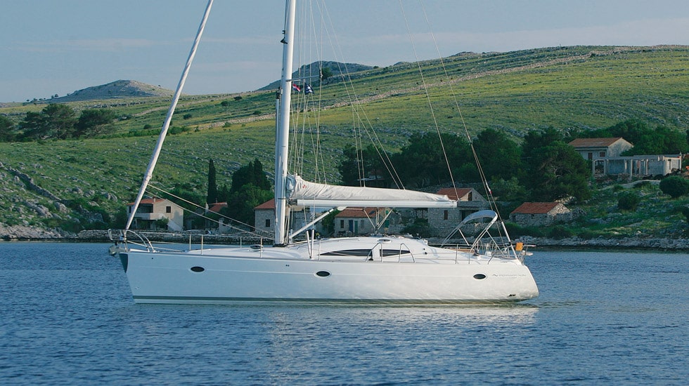 The raised galley has a three-burner stove, deep double sinks, well-fiddled counter space, and ample stowage. As for water, the Impression’s 158 gallons are enough for an ocean crossing. The two-cabin version has a double aft cabin that competes with the V-berth forward for comfort and spaciousness. The main saloon has a huge folding table, generous seating, and a forward-facing nav station.