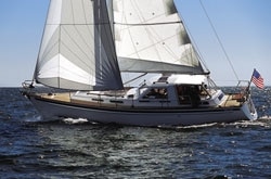Setting the mainsail entails going to the mast, which suits me fine. By terminating the halyards and reefing lines there, you avoid the tangle of tails that clutters so many cockpits and often tumbles wetly into the cabin. Also, the protection offered by the hard top would be compromised if it were penetrated so the lines could be run aft. Grabrails on the roof and inboard shrouds make getting to and from the mast a snap. However, once there, the footing’s not so secure because the builder didn’t put nonskid on the coachroof but fitted wooden strakes on the smooth gelcoat surface. A molded pattern or applied nonskid like ABS would make a big difference there, and on top of the hard top, too. Mast pulpits would enhance security when reefing, and a step on the mast would make attaching the halyard easier. Otherwise, the mainsail, with its full-length battens and Elvström Zippack, is easy to set and stow. The jib, on its furler, sets from the cockpit.