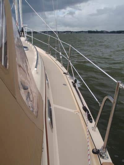 One downside to the low-slung cabin is that handholds are now often positioned just above ankle level, rendering them close to useless for upright sailors. One exception is found on top of the increasingly popular raised-deck-saloon models, which elevates these handholds to a viable level for at least a portion of the journey forward. Anticipating an aging demographic, Gerry Douglas of Catalina Yachts designed a full-length trunk cabin with handholds at the same level as the solid lifelines. In theory, this “walker” approach can extend our careers on the water exponentially.