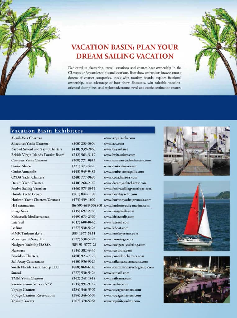 If you’re heading to the U.S. Sailboat Show in Annapolis, Maryland, Oct. 8-12, 2015, be sure to take a stroll through Vacation Basin. This is where you’ll find charter company representatives and brokers who can answer all your questions, check out the boats and discover new charter destinations — all in one location.