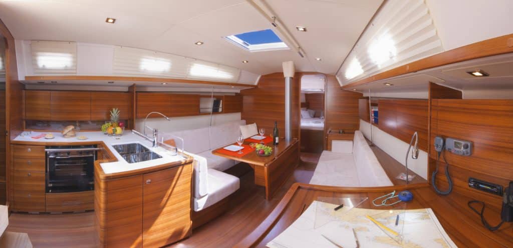The two steering wheels are a trademark of the boat with no compromise on sailing equipment. An easily adjustable genoa and mainsheet system helps in trimming sails and gives you ability to furl the genoa without sending crew forward to adjust the leech, this together with single line reefing mainsail gives total control from the cockpit.