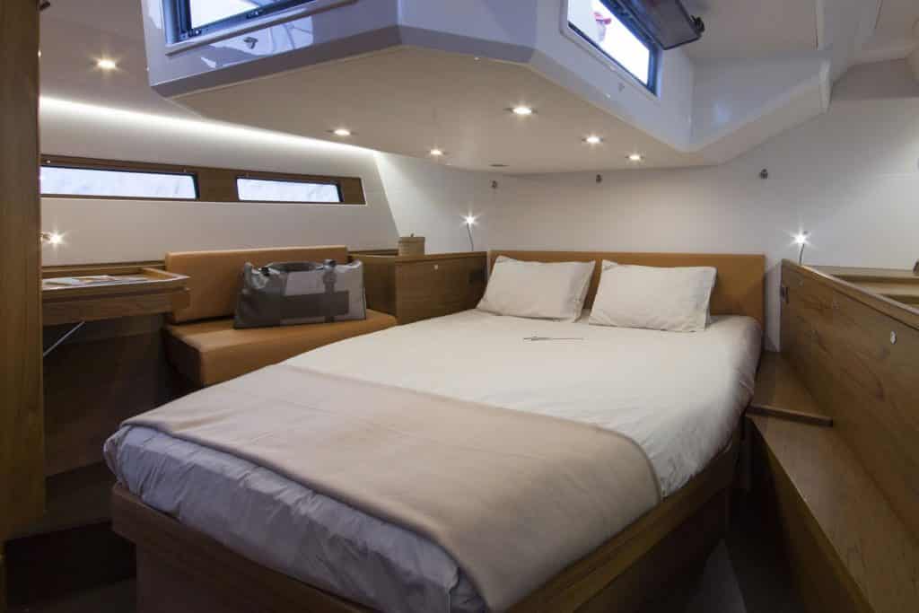 The cockpit is practical, safe and comfortable : the helm station is equipped with all necessary assistance for single-handed sailing (oversized winches placed at the helm station, an optional self-tacking track can be integrated).