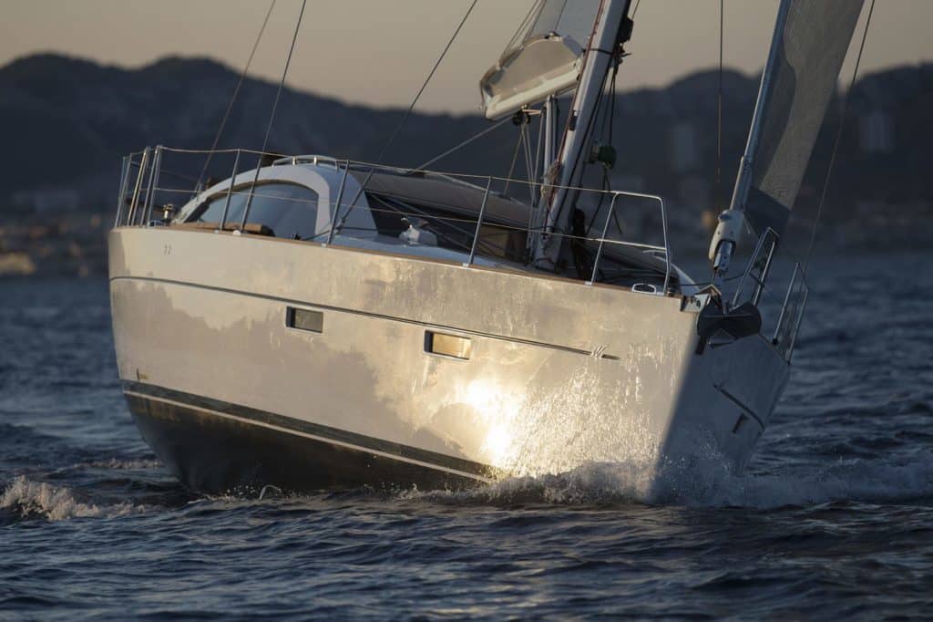 The sleek lines of the saloon roof emphasize the yacht’s thoroughbred style. The uncluttered deck offers great visibility forward thanks to the flush deck hatches and the control lines lead aft to the cockpit.
