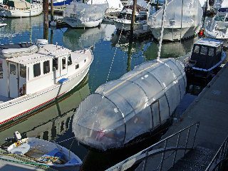 Now granted, I just heard that the New England winter this year was the fourth warmest on record, but this cover arrangement is slick! We were walking around in shirt sleeves this weekend in Portland Maine! The cover is made up of almost clear heat shrink wrap over PVC hoops with a single wooden strip in the fore and aft plane making for a really beautiful green house which will keep things warm and toasty during a sunny day. This owner made the height high enough so that they can walk around on deck. If it ever does snow here in New England again, the shape will deflect well enough to keep any excessive accumulation from occuring. The frame is reusable from one year to the next. In general, my idea of a nice winter cocoon. Liveaboard boaters, you want this! Power or sail, I can see this shape and the hoop concept being employed on a lot of different boats.